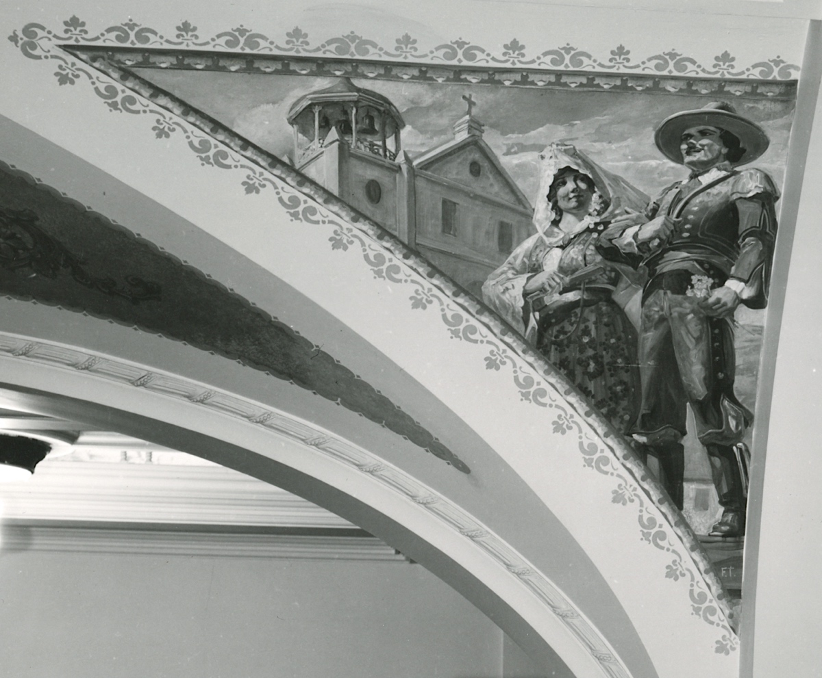 Fausto’s design for the bank interior was based on a history of the west written by O.E. Monnette, California Chronology. This commission included a series of thirteen narrative murals and two large ceiling medallions, “Allegory of Industry” and “Triumph of California.”